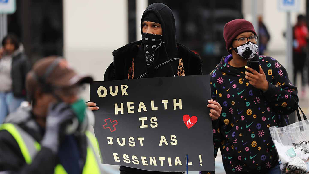 As a result, healthcare workers, other first responders and workers in other essential services continue to be forced to work in unsafe, dangerous and risky conditions. These workers and other workers – in transit, restaurants, supply chains and other production – have been speaking out. Some have organized strikes and protests to force a change in their potentially deadly working conditions.