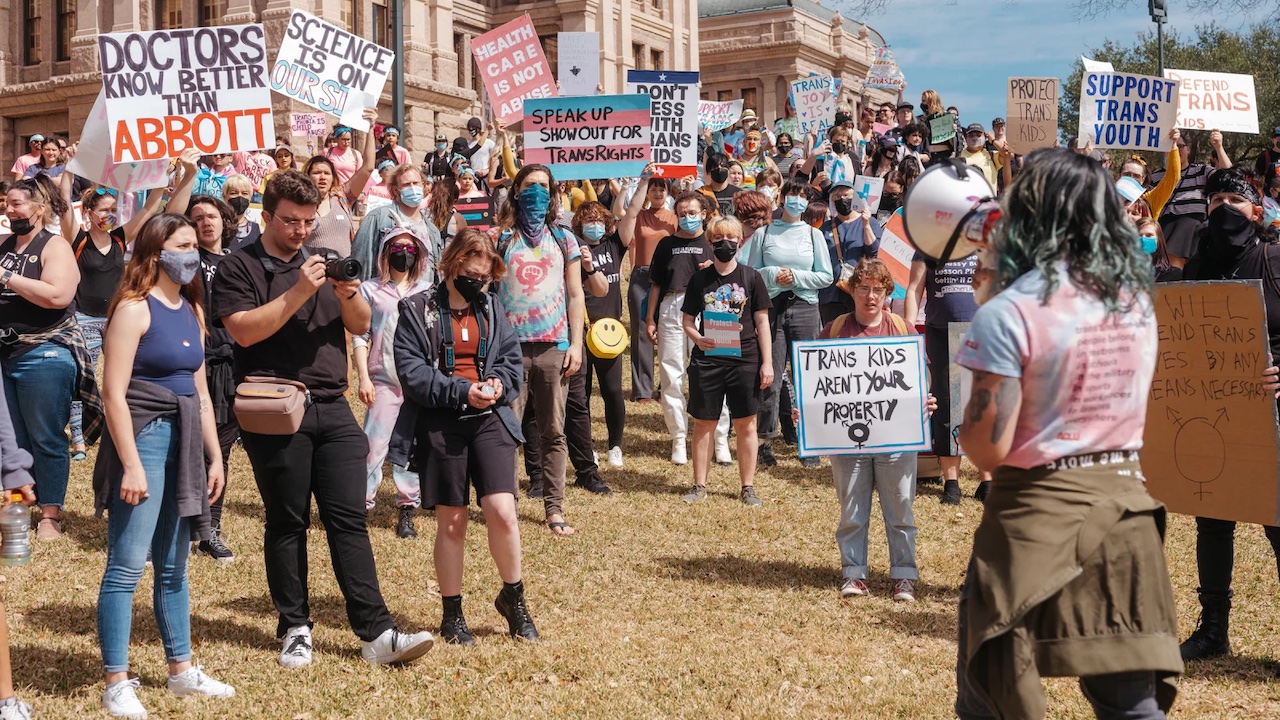 Demonstrators protest a Texas policy to regard gender-affirming treatments for transgender youth as "child abuse" at the State Capitol in Austin, Texas on March 1, 2022. (Christopher Lee, New York Times)