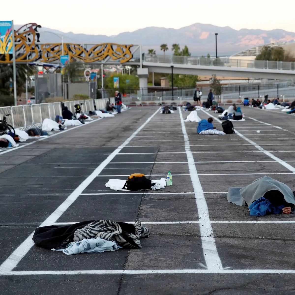 Featured image credit: Homeless people sleep in a parking lot with spaces marked for social distancing in Las Vegas. Photograph: Steve Marcus/Reuters