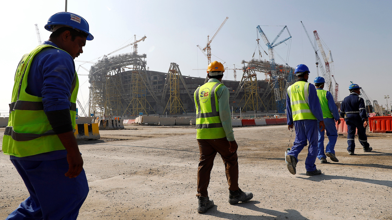 Workers walk towards the construction site of the Lusail stadium which will be build for the upcoming 2022 Fifa soccer World Cup during a stadium tour in Doha, Qatar, December 20, 2019. REUTERS/Kai Pfaffenbach - RC2XYD97QSDA