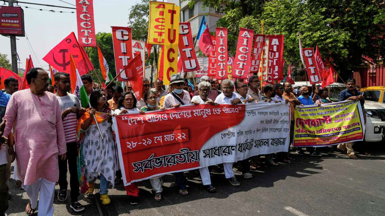 Activists and supporters of the Left Front, Indian National Congress and various trade unions walk in support of a nationwide two-day strike in Kolkata, India, Monday, March 28, 2022. Banner in Bengla reads, "Save the country, save the people of the country, support the all India strike". Image credit: Bikas Das/AP
