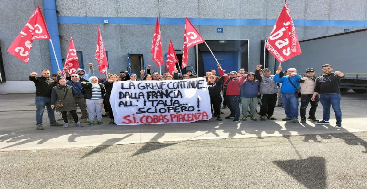 The banner in the photo reads: “The strike continues from France to Italy… Strike!”