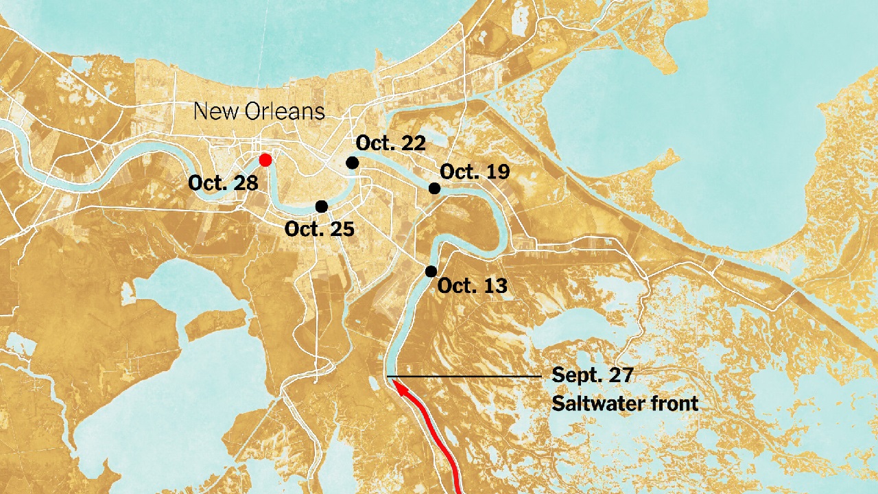 The people of New Orleans and smaller communities along the Mississippi River are facing a ticking time bomb that could cost them their drinking water supply for months. Saltwater from the Gulf of Mexico is flowing up the Mississippi River, and if it does not stop, it will contaminate their water treatment plants in a matter of weeks, pushing saltwater into the city pipes and homes. If it reaches the city, the people of New Orleans will not have access to safe drinking tap water and will have to resort to buying bottled water, depending on water trucks, or expensive desalination machines. Also, saltwater could corrode the city’s lead pipes, releasing its poisonous elements. This has already affected communities, like Plaquemines and St. Bernard, downriver from New Orleans.