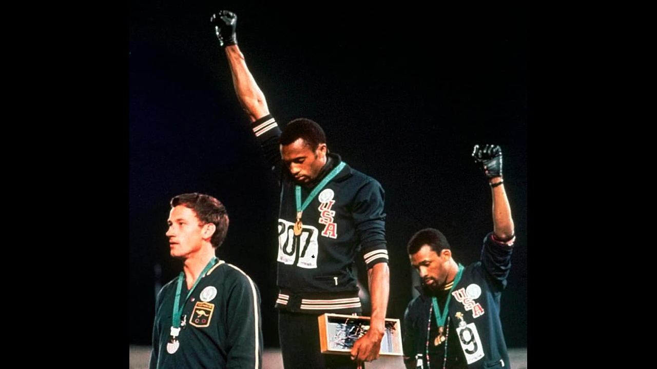 Mexico City, 1968: two black gloved fists are raised in the air during the awards ceremony for the 200-meter sprint at the Olympics, as the U.S. National Anthem. Tommie Smith and John Carlos, two Black athletes representing the United States, raised their fists in protest of the deep racism that Black people in America faced. They stood on the podium shoeless to represent the terrible poverty in inner cities. Their protest was electric and sent shockwaves around the world; the picture of their protest has since become a defining image of the 1960s.