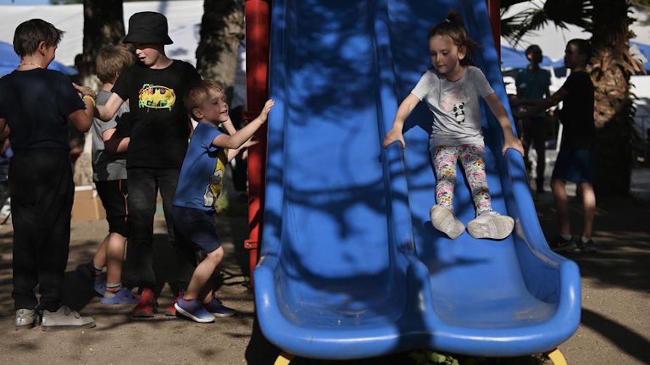 Ukrainian refugee children playing at the Benito Juarez Sports Complex shelter in Tijuana, Mexico where more than 2,000 people are awaiting asylum to enter the U.S. April 8, 2022. {Carlos A. Moreno/NPR}