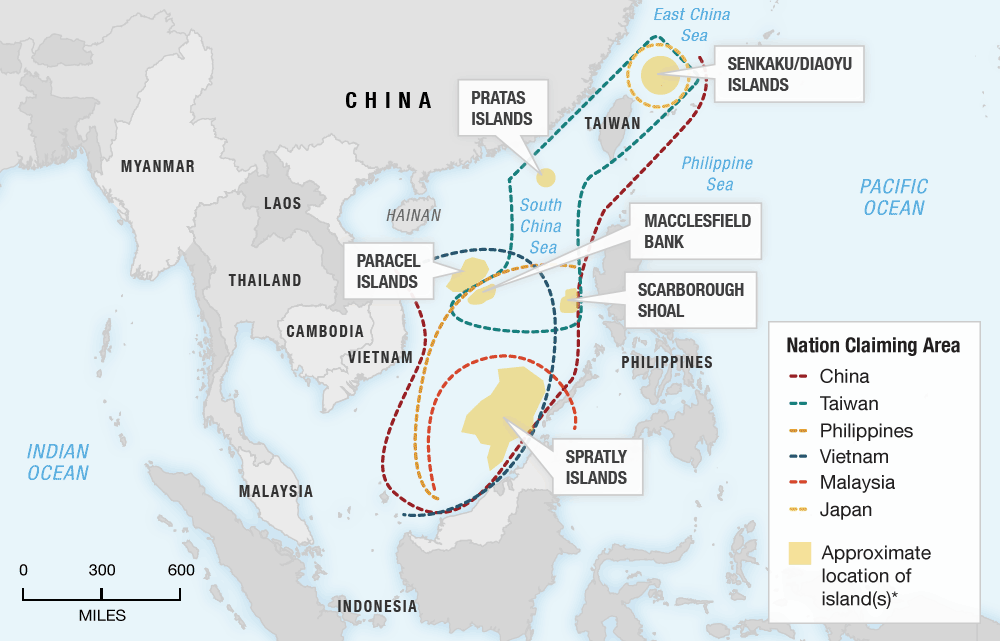 In addition to the role of Taiwan in the world’s economy, there is the question of who will dominate the South China Sea, which serves as the connection between the Pacific and Indian Oceans. More than one-third of all international commerce, a value of close to $4 trillion dollars every year, passes through these maritime waters. This includes 90% of the petroleum shipped to China, Japan and South Korea which pass through these waters and 40% of China’s exports. To protect its interests, China claims this as its territorial waters and has built “artificial islands” in the Spratly Islands, which now serve as military outposts.